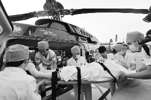 昨日早上5時(shí)整,999直升機(jī)從密云機(jī)場起飛;5時(shí)23分,急救直升機(jī)抵達(dá)999清河急救中心停機(jī)坪。5分鐘后,救護(hù)車載著老人抵達(dá)!奥c(diǎn)!慢點(diǎn)!讓開車門,小心直升機(jī)尾翼!”一位渾身包著繃帶、戴著頸托的老人被抬出了救護(hù)車,老人緊閉雙眼,顯得十分虛弱。擔(dān)架上的老人被小心翼翼地移上直升機(jī)。旋即,直升機(jī)騰空而起,前往天津?yàn)I海國際機(jī)場。