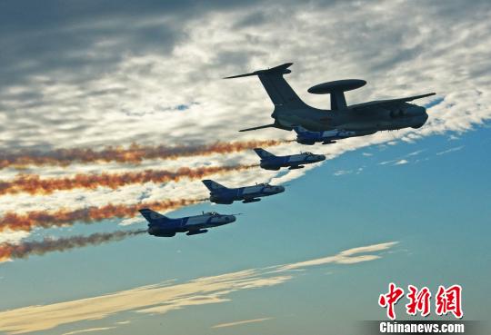 國產(chǎn)預(yù)警飛機(jī)經(jīng)過嚴(yán)格試飛定型后,裝備部隊并參與執(zhí)行新中國成立60周年大閱兵任務(wù)。圖為預(yù)警機(jī)和護(hù)衛(wèi)飛機(jī)進(jìn)行飛行編隊訓(xùn)練!∽T超 攝