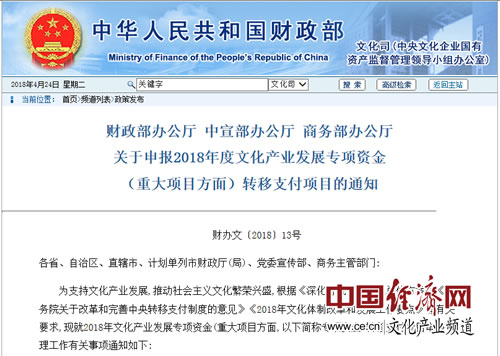 通知說(shuō)明,為支持文化產(chǎn)業(yè)發(fā)展,推動(dòng)社會(huì)主義文化繁榮興盛,根據(jù)《深化財(cái)稅體制改革總體方案》《國(guó)務(wù)院關(guān)于改革和完善中央轉(zhuǎn)移支付制度的意見(jiàn)》《2018年文化體制改革和發(fā)展工作要點(diǎn)》等有關(guān)要求,財(cái)政部、中宣部和商務(wù)部聯(lián)合管理2018年文化產(chǎn)業(yè)發(fā)展專項(xiàng)資金(重大項(xiàng)目方面,以下簡(jiǎn)稱專項(xiàng)資金)轉(zhuǎn)移支付項(xiàng)目申報(bào)工作。