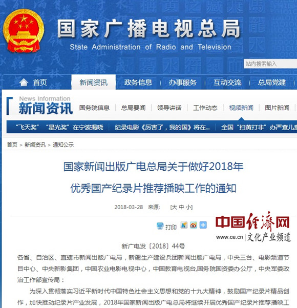 國(guó)家新聞出版廣電總局關(guān)于做好2018年優(yōu)秀國(guó)產(chǎn)紀(jì)錄片推薦播映工作的通知