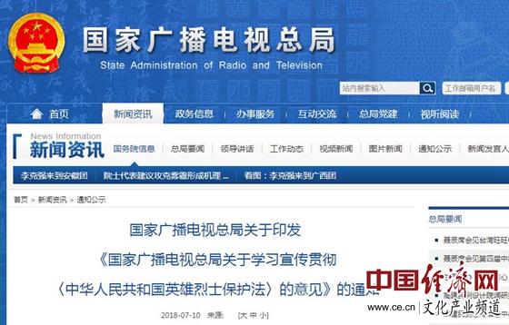 經(jīng)濟(jì)日?qǐng)?bào)-中國(guó)經(jīng)濟(jì)網(wǎng)北京7月11日訊 近日,國(guó)家廣播電視總局印發(fā)《國(guó)家廣播電視總局關(guān)于學(xué)習(xí)宣傳貫徹〈中華人民共和國(guó)英雄烈士保護(hù)法〉的意見(jiàn)》(以下簡(jiǎn)稱(chēng)《意見(jiàn)》)的通知。《意見(jiàn)》指出:鼓勵(lì)和支持廣播電視播出機(jī)構(gòu)、信息網(wǎng)絡(luò)視聽(tīng)節(jié)目服務(wù)單位、廣播電視節(jié)目制作經(jīng)營(yíng)機(jī)構(gòu)等創(chuàng)作以英雄烈士事跡為題材、弘揚(yáng)英雄烈士精神的專(zhuān)題片、紀(jì)錄片、訪談節(jié)目、綜藝節(jié)目、電視劇、網(wǎng)絡(luò)視聽(tīng)節(jié)目等;鼓勵(lì)英雄烈士題材的劇目積極申報(bào)電視劇選題規(guī)劃、網(wǎng)絡(luò)原創(chuàng)視聽(tīng)節(jié)目規(guī)劃。