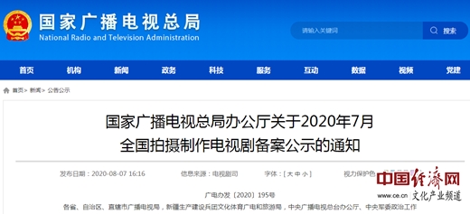 經(jīng)濟(jì)日?qǐng)?bào)-中國(guó)經(jīng)濟(jì)網(wǎng)北京8月10日訊 近日,國(guó)家廣播電視總局公布7月份全國(guó)拍攝制作電視劇備案公示情況,據(jù)悉,2020年7月,全國(guó)電視劇拍攝制作備案公示的劇目共49部、1640集。