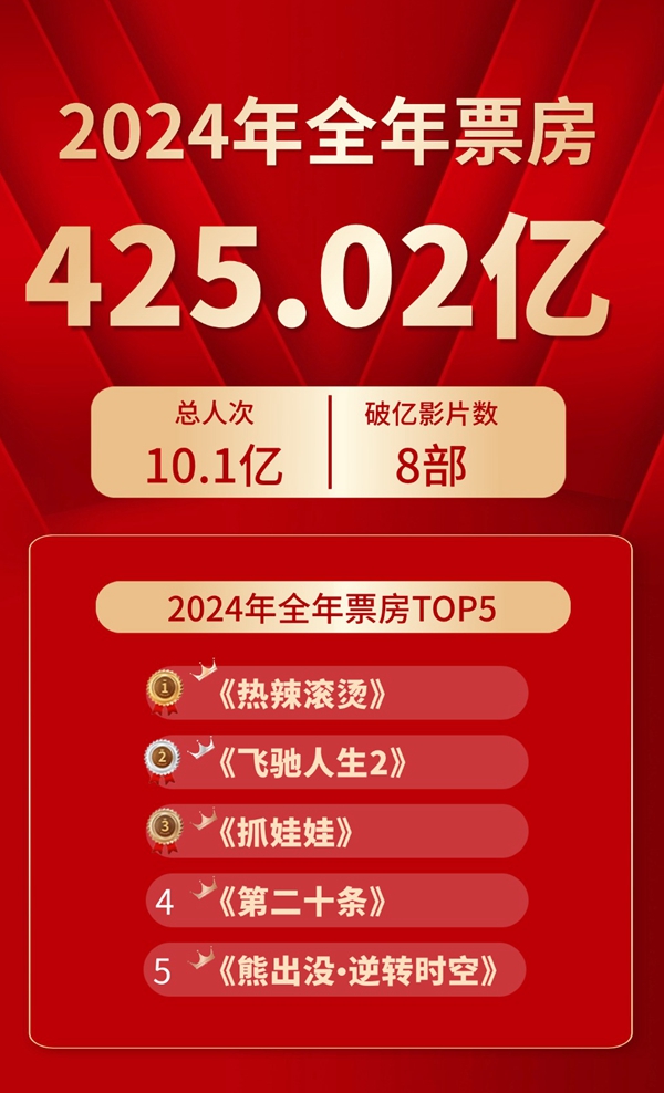 據(jù)貓眼專業(yè)版數(shù)據(jù),2024年全年共有8部影片破10億,年度票房冠軍為春節(jié)檔影片《熱辣滾燙》,全年大盤占比為8.1%。年度TOP10影片分別為《熱辣滾燙》《飛馳人生2》《抓娃娃》《第二十條》《熊出沒(méi)·逆轉(zhuǎn)時(shí)空》《默殺》《志愿軍:存亡之戰(zhàn)》《年會(huì)不能停!》《哥斯拉大戰(zhàn)金剛2:帝國(guó)崛起》《你想活出怎樣的人生》,其中,國(guó)產(chǎn)片占據(jù)八席,進(jìn)口片占據(jù)兩席,涵蓋類型包括喜劇、劇情、犯罪、戰(zhàn)爭(zhēng)、動(dòng)作、動(dòng)畫等。整體看來(lái),2024年電影市場(chǎng)仍呈現(xiàn)出較強(qiáng)的韌性和上升空間。