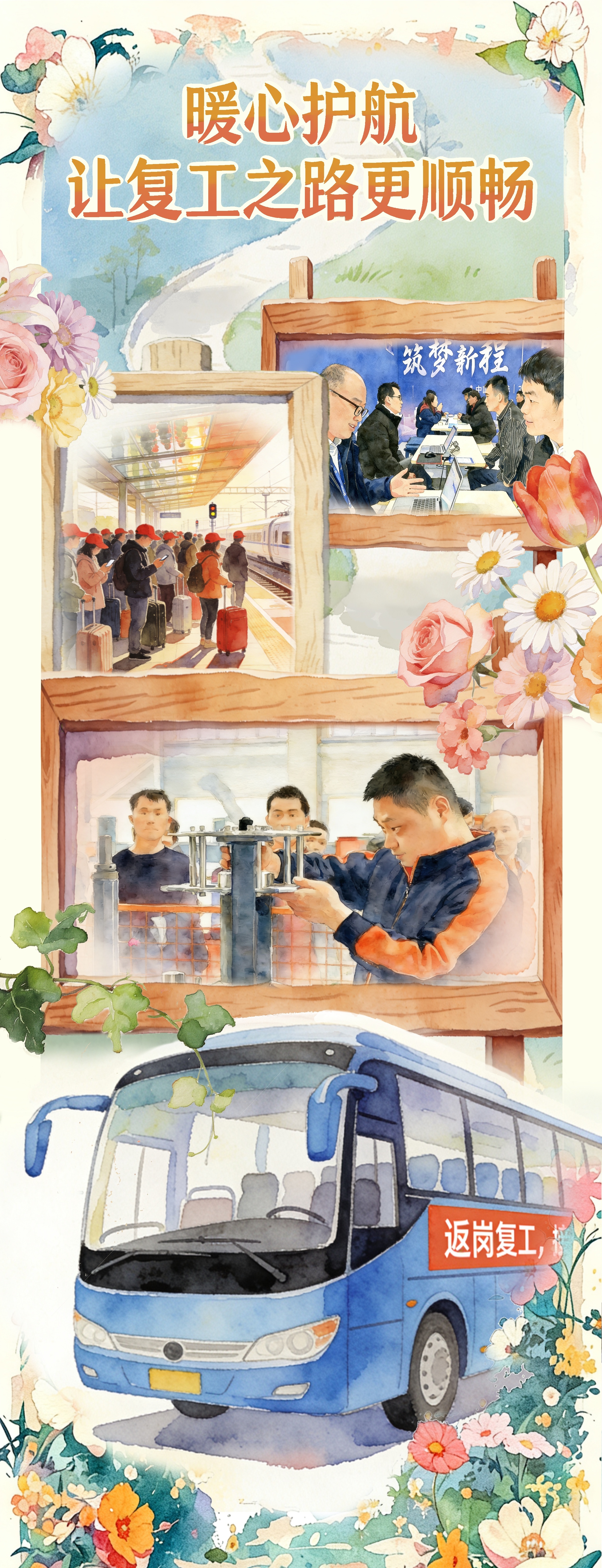 安心順暢的返崗之路,離不開(kāi)各地各部門(mén)的暖心護(hù)航。多地立足務(wù)工人員出行實(shí)際,精準(zhǔn)對(duì)接需求、通力協(xié)同發(fā)力,通過(guò)開(kāi)通返崗專(zhuān)列、專(zhuān)車(chē)、包機(jī)等多種方式,著力為返崗人員提供“點(diǎn)對(duì)點(diǎn)、一站式”的輸送服務(wù);交通樞紐設(shè)立專(zhuān)屬服務(wù)區(qū)域,工作人員主動(dòng)提供飲水、引導(dǎo)、咨詢(xún)等便民服務(wù);鐵路部門(mén)優(yōu)化檢票組織流程,提升運(yùn)輸效率,鐵路12306App推出“務(wù)工人員預(yù)約購(gòu)票”服務(wù),進(jìn)一步簡(jiǎn)化務(wù)工人員購(gòu)票流程……各項(xiàng)舉措將民生需求落細(xì)落實(shí),讓返崗旅途更順暢、更暖心。