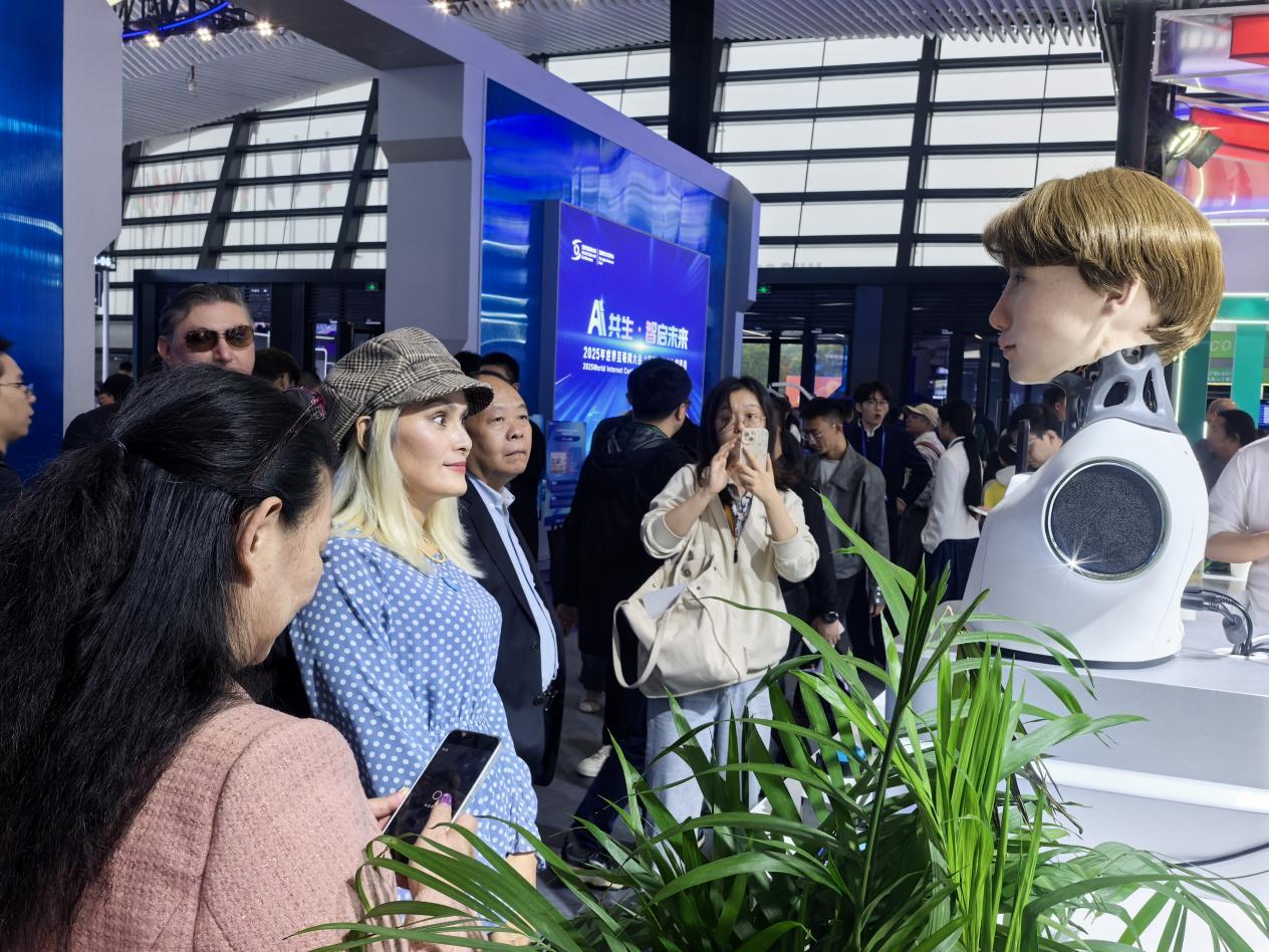 觀眾與松延動力仿生機器人互動,這款自主研發(fā)的仿生機器人可實時識別并模仿互動對象的各種面部表情。中國經濟網(wǎng)記者郭文培/攝