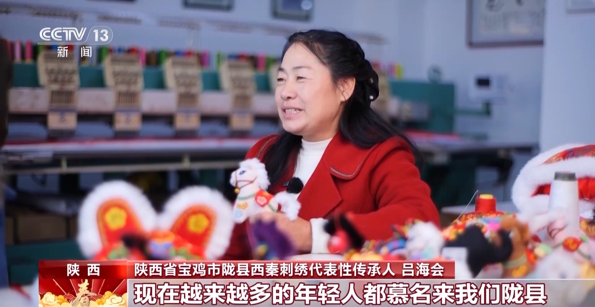 陜西省寶雞市隴縣西秦刺繡代表性傳承人 呂海會:現(xiàn)在越來越多年輕人都慕名來我們隴縣看馬社火,也讓更多的人了解到西秦刺繡、喜歡西秦刺繡。我們在家門口傳播手工布藝的同時,也讓大家得到一份收入,心里非常開心。