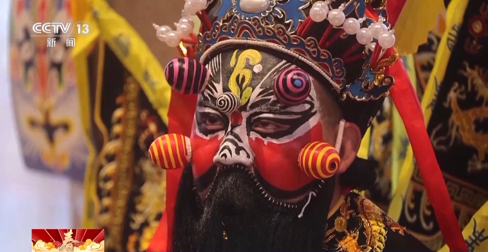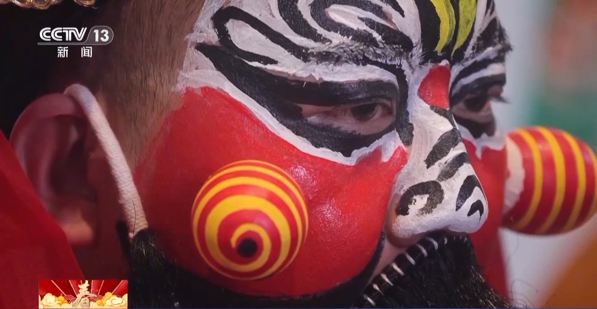 總臺央視記者 何莉:這個角色就是社火當中的黑虎趙公明,人們認為他可以除瘟消災、帶來財運。他臉上凸起,看起來非常立體,而這些凸起就是用普通的雞蛋殼制作而成。