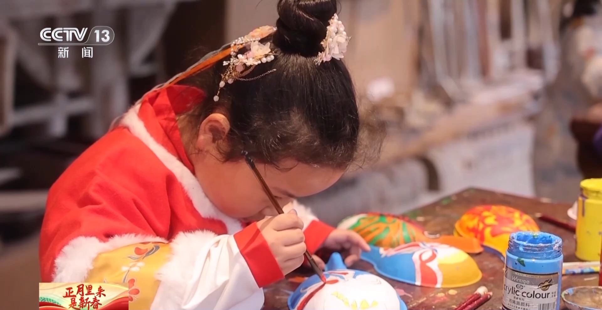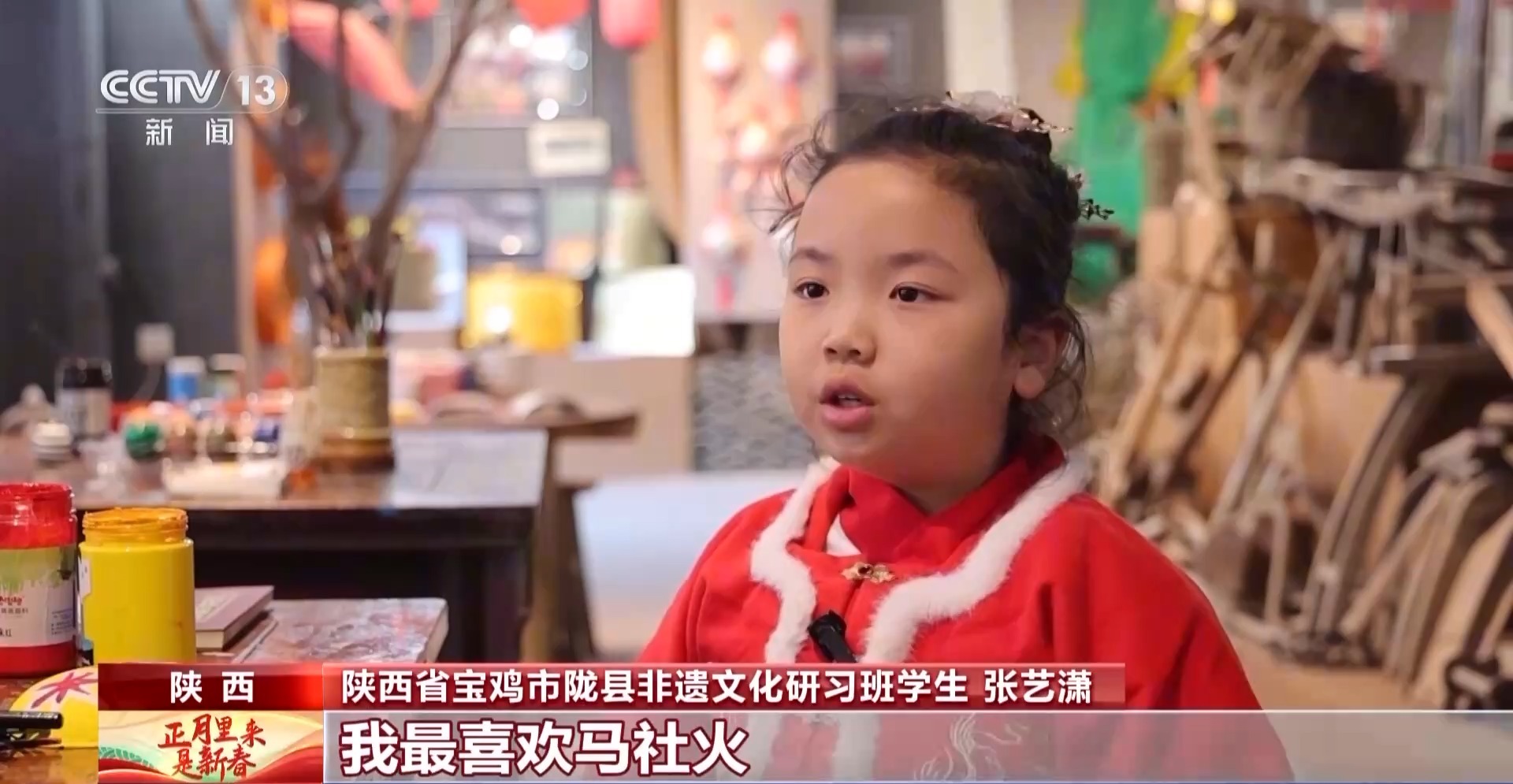 陜西省寶雞市隴縣非遺文化研習班學生 張藝瀟:我最喜歡馬社火,因為非常威武,我今天還畫了社火臉譜。