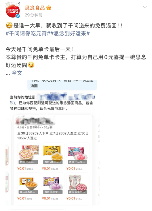 3月3日元宵節(jié)當(dāng)天,思念湯圓、五芳齋、三全食品等湯圓品牌通過官方社交賬號(hào)發(fā)文:“千問請(qǐng)你吃元宵,今天是免單卡最后一天,走過路過別錯(cuò)過?!庇芯W(wǎng)友笑稱,“湯圓品牌的時(shí)間點(diǎn)掐的真好,免單卡最后一天,把銷量安排的明明白白。”