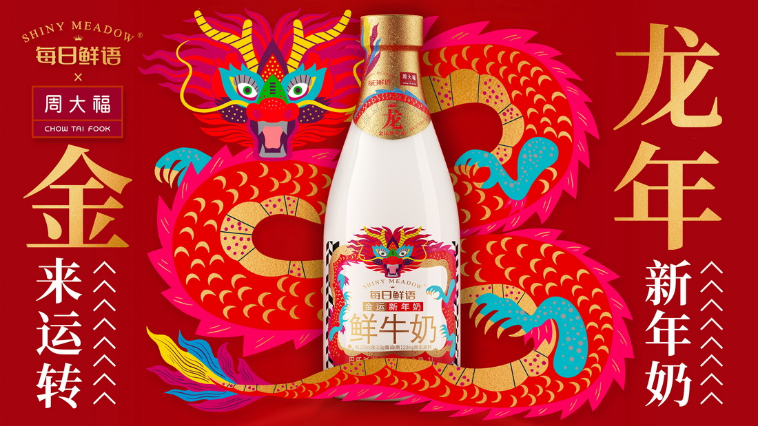 品牌跨界聯(lián)名,不斷活化品牌,帶來增益轉(zhuǎn)化。春節(jié)期間,每日鮮語攜手周大福,推出“金運新年奶”,開啟“龍來運轉(zhuǎn)”新一年,為消費者帶來“黃金”營養(yǎng)。