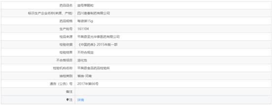 事實(shí)上,這并非四川逢春制藥有限公司首次出現(xiàn)藥品質(zhì)量缺陷。中國(guó)經(jīng)濟(jì)網(wǎng)記者查詢(xún)發(fā)現(xiàn),此前該公司生產(chǎn)的益母草顆粒就曾被通報(bào)不合格。