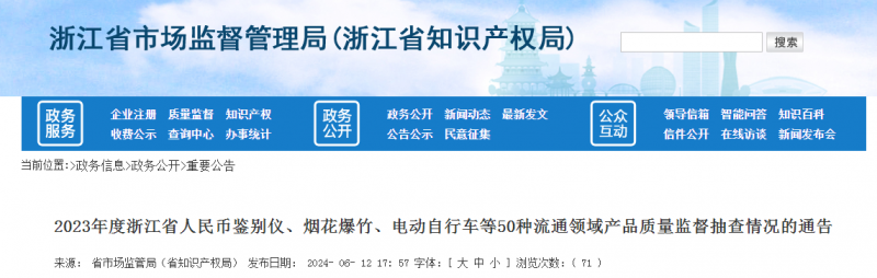 2024年6月12日,浙江省市場監(jiān)督管理局網(wǎng)站發(fā)布2023年度浙江省人民幣鑒別儀、煙花爆竹、電風(fēng)扇、電動(dòng)自行車等50種流通領(lǐng)域產(chǎn)品質(zhì)量監(jiān)督抽查情況的通告。