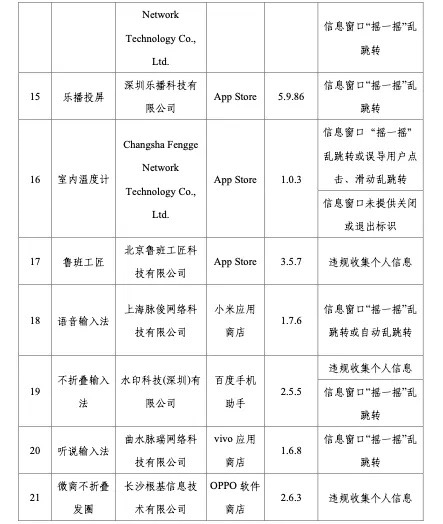 工信部稱,依據(jù)《個人信息保護法》《網(wǎng)絡(luò)安全法》《電信條例》《電信和互聯(lián)網(wǎng)用戶個人信息保護規(guī)定》等法律法規(guī),工信部持續(xù)整治APP侵害用戶權(quán)益的違規(guī)行為,在近期組織的第三方檢測機構(gòu)進行抽查中,共發(fā)現(xiàn)27款A(yù)PP及SDK存在侵害用戶權(quán)益行為。侵權(quán)方式包括信息窗口“搖一搖”亂跳轉(zhuǎn)或誤導(dǎo)用戶滑動亂跳轉(zhuǎn)、違規(guī)收集個人信息、APP頻繁自啟動和關(guān)聯(lián)啟動、信息窗口未提供關(guān)閉或退出標(biāo)識、強制用戶使用定向推送功能、SDK信息公示不到位以及強制、頻繁、過度索取權(quán)限等,涉及小米商店語音輸入法、vivo應(yīng)用商店的聽說輸入法、App Stroe的樂播投屏等。