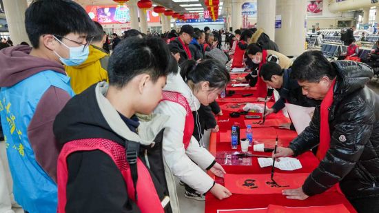 文化展示區(qū)里,傳統(tǒng)韻味與暖心服務(wù)交織成獨特風(fēng)景。鐵路部門、大連車站派出所、大連市慈善總會、大連青年書協(xié)的書法愛好者們揮毫潑墨,一幅幅春聯(lián)、一個個福字飽含美好祝愿,免費送到旅客手中;紅包拓印體驗更讓大家親手解鎖新春儀式感,沉浸式感受傳統(tǒng)年俗的魅力。大連北站的非遺展示區(qū)人氣爆棚:剪紙藝人指尖生花,一張張馬年主題剪紙惟妙惟肖;吹糖人、面塑攤位前,孩子們圍攏觀望,老師傅們巧手翻飛,將滾燙的糖漿、柔軟的面團(tuán)化作形態(tài)各異的小動物,引得陣陣歡呼;五谷畫展臺則以各色谷物為料,勾勒出寓意吉祥的新春圖景,讓旅客直觀感受傳統(tǒng)技藝的匠心與溫度。
