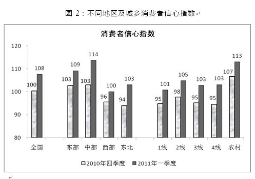 2011年一季度中國消費者信心指數(shù)為108,比2010年四季度大幅上升8點,接近近兩年高點。消費者對當前經(jīng)濟形勢的滿意度和對未來經(jīng)濟走勢的預(yù)期樂觀度均明顯上升,持樂觀態(tài)度的消費者比重均接近兩年內(nèi)的最高點。