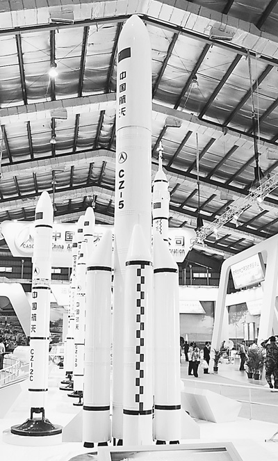 長征五號運載火箭模型。長征五號系列運載火箭是我國新一代大型運載火箭。以CZ—5E為例,其為兩級狀態(tài)火箭,芯級直徑5米,捆綁 4個3.35米直徑的助推器,起飛質(zhì)量856噸,計劃2014年實現(xiàn)首飛。CZ—5E火箭已初步被確定為用于月球表面采樣和返回任務用火箭。