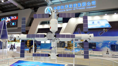 在此次航展中,中國航天科技集團公司推出代表月球探測工程最新成果的“嫦娥二號”衛(wèi)星模型,代表“北斗導航”工程、直徑達7米、蔚為壯觀的天地一體衛(wèi)星運行沙盤,1:1的“天宮一號”目標飛行器模型、新一代運載火箭以及代表深空探測計劃的“螢火一號”衛(wèi)星模型等國家重大工程項目近100項新展品首次亮相。圖為長期有人照料的空間站模型。(宗文)
